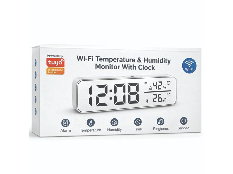 Smart Wi-Fi-ansluten temperatur och fuktighetsmätare med tydlig LED-display och klocka. Visar mätvärden direkt i mobilen via Tuya/Smart Life och kan avläsas var du än befinner dig. Produkten är kompatibel med Amazon Alexa och Google Assistant.